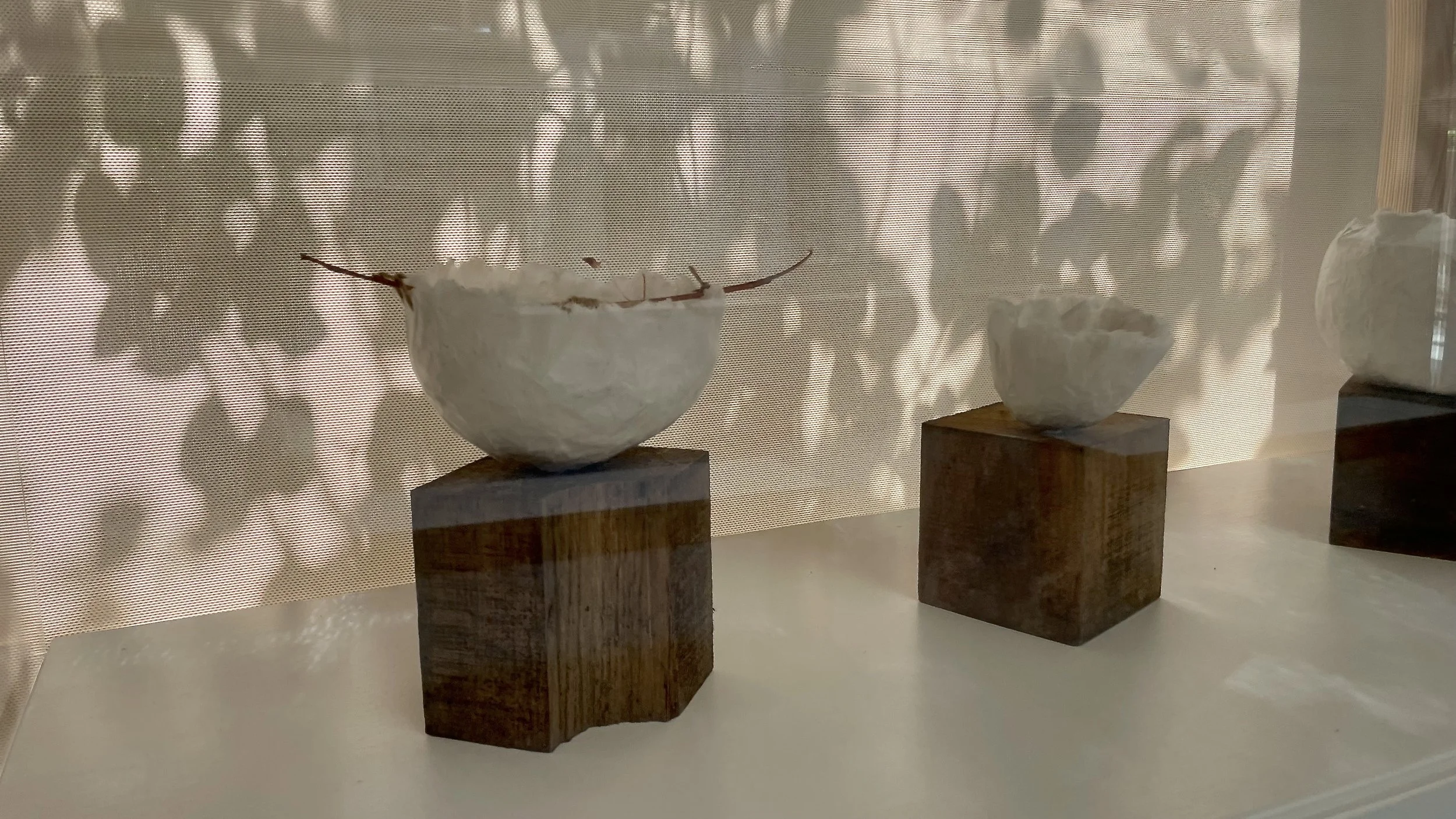 With Japanese paper Vivienne builds vessels from its delicate layers and brings in fragments of wood, leaves, seeds, and stones she gathers from the landscapes around her. They carry light, stillness, and the quiet energy of place.